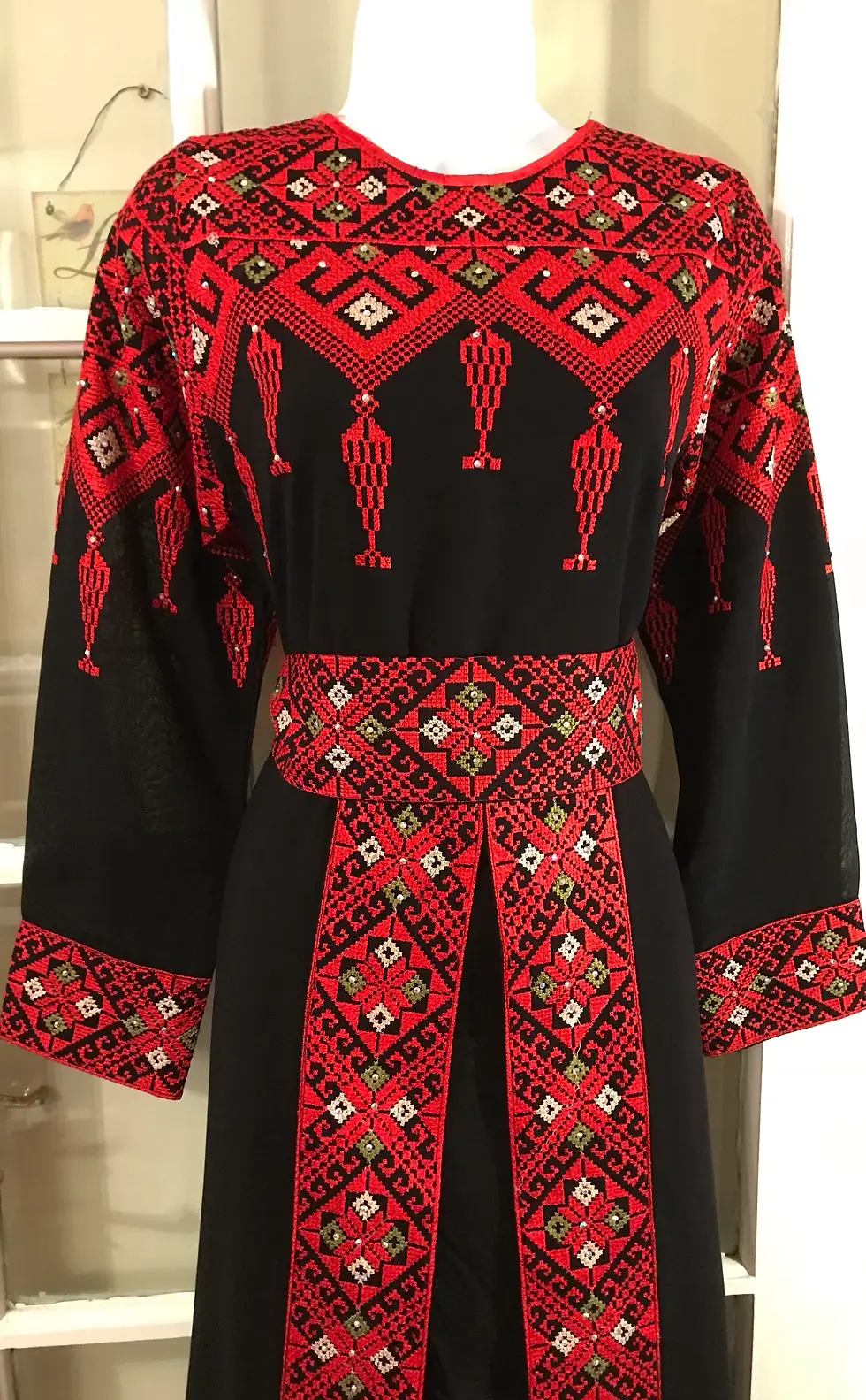 È in questa fase storica che il Tatreez acquisisce il suo significato più potente: quello di resistenza culturale. Dopo il 1967, e in particolare durante i periodi di occupazione, quando persino i colori della bandiera palestinese potevano essere considerati una provocazione e la loro esposizione punita, l'astuzia e la saggezza delle donne trovarono rifugio nel tessuto. Il Thobe divenne la bandiera indossabile: le ricamatrici iniziarono a orchestrare i colori del ricamo in modo da replicare, in un mosaico apparentemente innocuo, la bandiera palestinese. Utilizzavano sapientemente il rosso, il verde, il nero (il tessuto di base) e il bianco per i dettagli, una combinazione discreta ma inequivocabile che permetteva alle donne di indossare la loro appartenenza in pubblico, sfidando l'occupazione attraverso la bellezza e la tradizione.